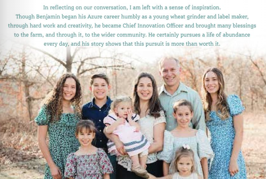 I ask Benjamin how Azure has impacted his life and that of his family. With his wife, Anne Marie, and eight children ranging in age from five months to 20 years, Benjamin pauses before responding. He says his children benefit from many of the same experiences he had growing up on the farm—developing a strong work ethic, while also enjoying greater opportunities to learn as the farm has expanded. In addition to learning how to run a farm, they are picking up skills that span managing a business, repairing machinery, and programming a website. Their hands-on learning extends to building relationships and learning responsibility.